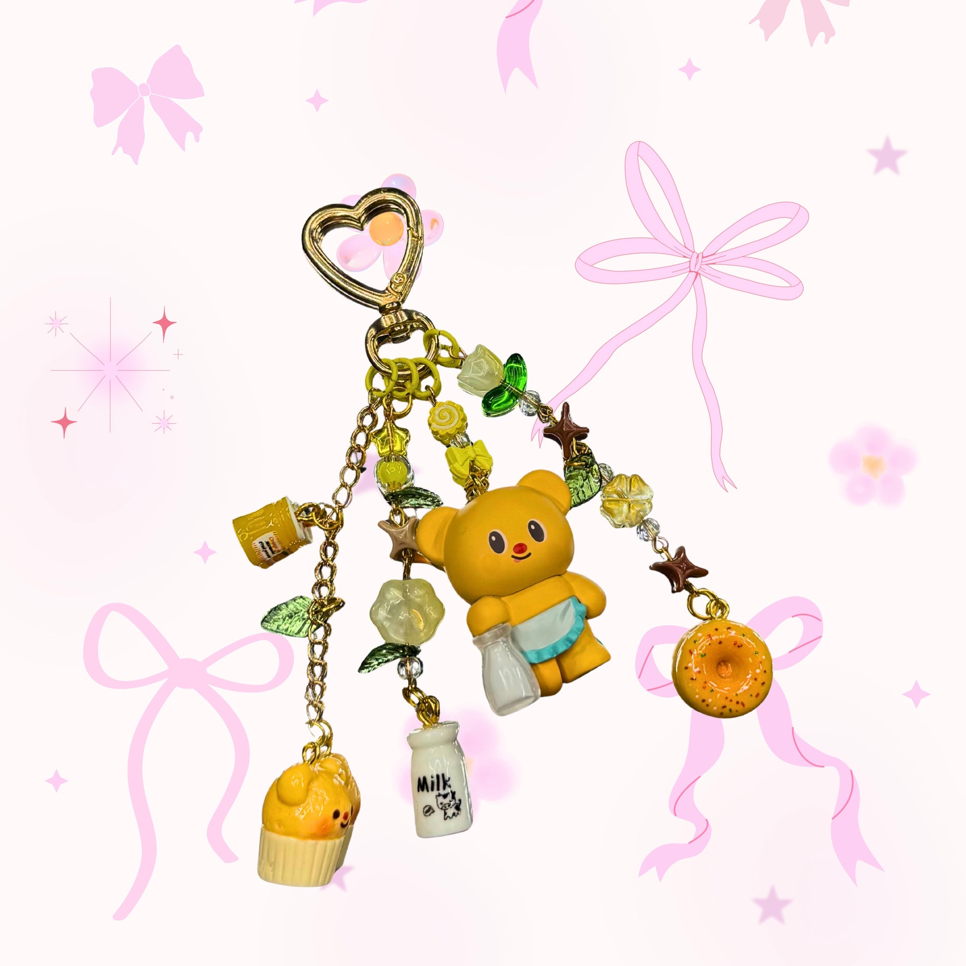 Featuring an authentic Butterbear figure holding a tiny milk bottle, this handmade charm is decorated with adorable breakfast-inspired details — a doughnut, bear cupcake, milk jug, and sparkly beads in cheerful yellow and beige tones.