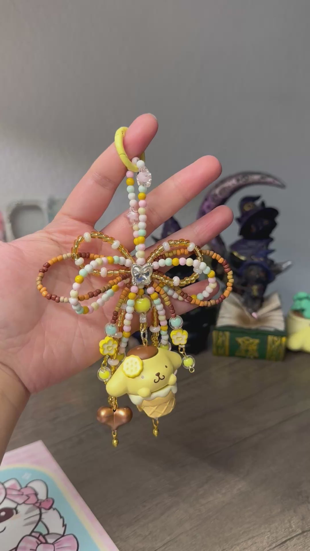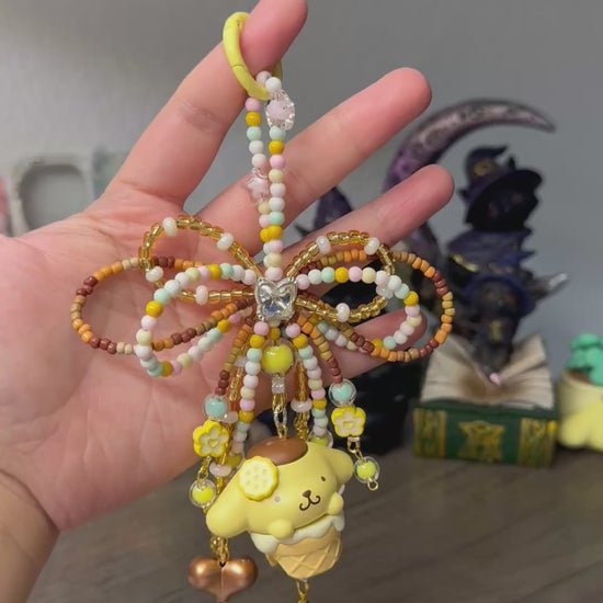 Featuring an authentic Sanrio Pompompurin figure, this handmade accessory is decorated with pastel beads, sparkly details, and a delicate pastel bow for the perfect cozy and cute aesthetic.